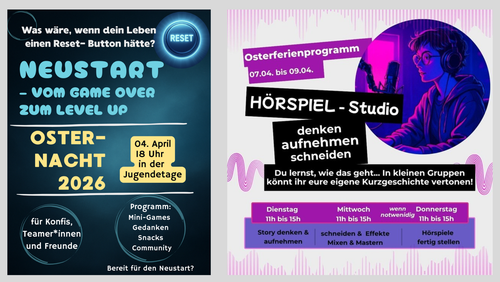 Bald starten die Osterferien und wir haben zwei tolle Angebote für die Jugendlichen, Konfis, und Teamer:innen (sowie eure Freunde) der Gemeinde.