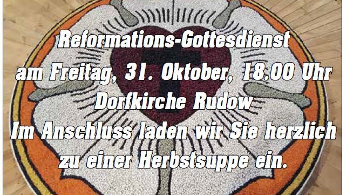 Herzliche Einladung zu unserem Reformations-Gottesdienst. Im Anschluss laden wir Sie ins Gemeindezentrum Dorfkirche zu einer Herbstsuppe ein.